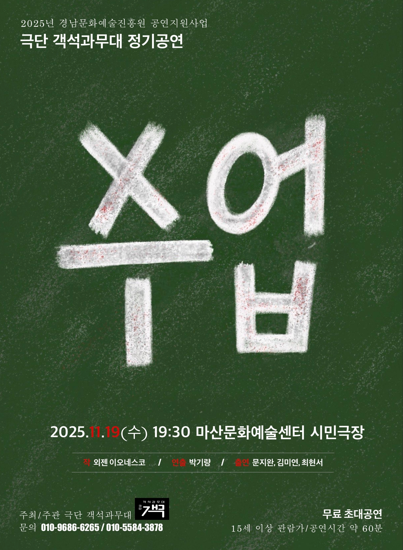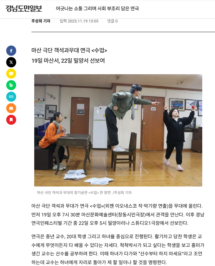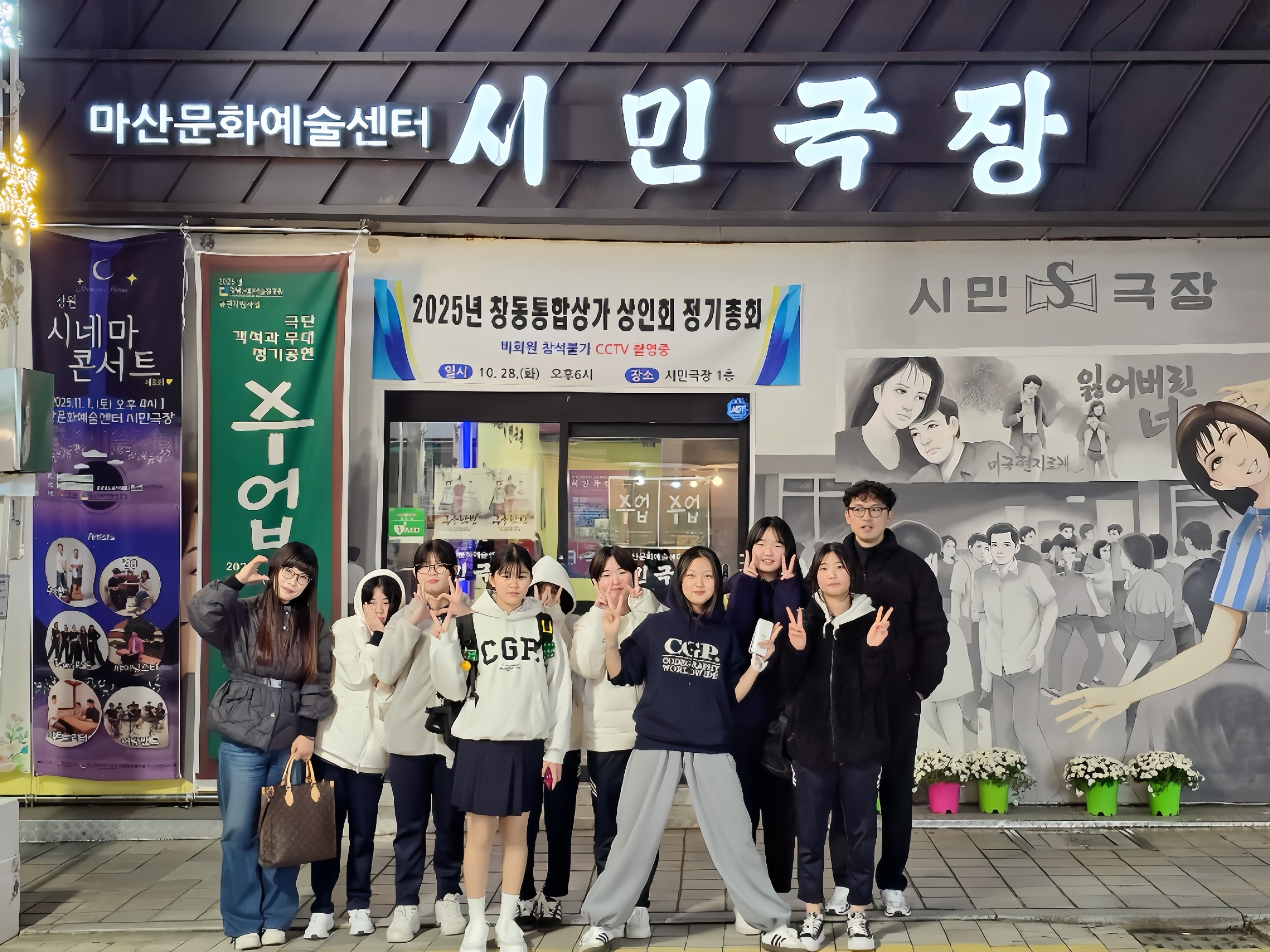 우리 학교 우분투 연극부 학생들은 11월 19일(수)요일 창동 문화예술 거리 일대에서 사제동행 문화예술 체험 활동을 실시하였습니다. 이번 활동은 마산 지역 극단 ‘객석과무대’에서 공연 중인 연극 〈수업〉을 관람하며 연극 예술의 표현 방식과 무대 연출, 배우의 움직임을 직접 경험하는 뜻깊은 시간으로 진행되었습니다.학생들은 극장 방문 전 사제동행으로 창동 문화예술 거리에서 함께 식사를 나누며 문화공간의 분위기와 지역 예술의 생동감을 체험하였고 공연 관람 후에는 작품의 메시지와 연출 방식에 대해 자유롭게 의견을 나누며 예술적 감수성과 창의적 사고를 확장하는 계기를 마련하였습니다. 이번 활동을 통해 우분투 연극부 학생들은 - 지역 문화예술 체험을 통해 공연 예술에 대한 이해 심화 - 배우·관객으로서의 감각과 표현 역량 향상 - 사제 간 소통과 관계 강화 등의 의미 있는 성과를 얻었습니다. 앞으로도 우리 학교는 학생들이 직접 보고, 듣고, 경험하는 문화예술 활동을 지속적으로 운영하여 풍부한 예술 교육 기회를 지속적으로 제공할 예정입니다.